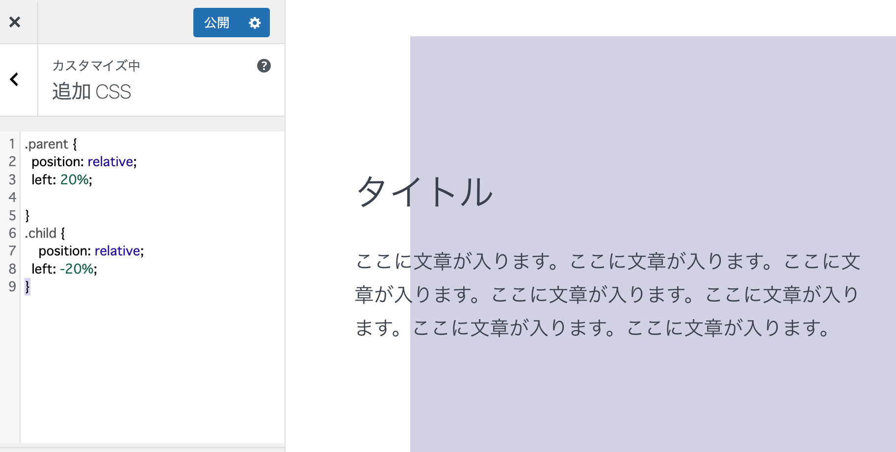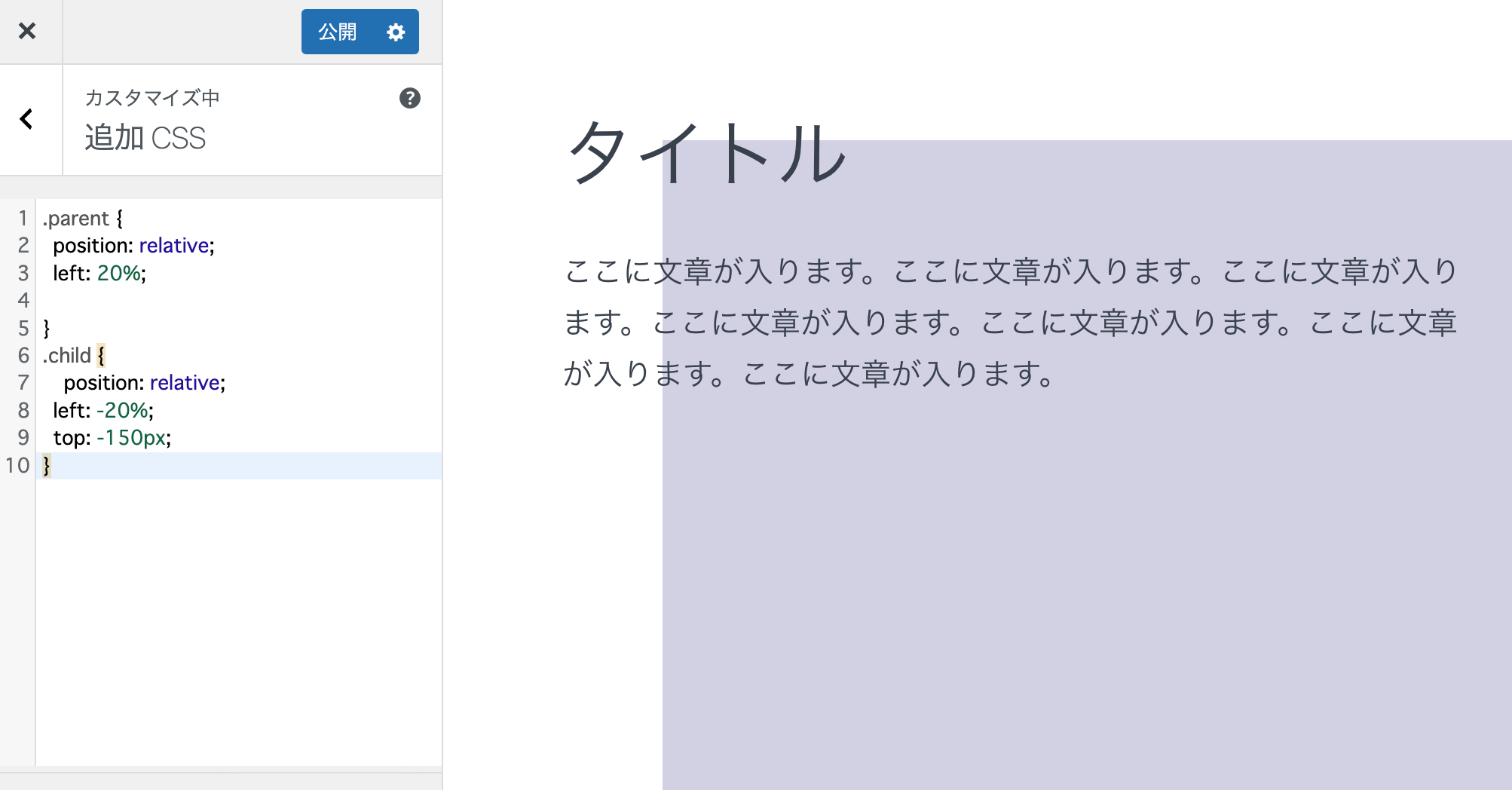 通常、親/子関係の場合 "relative"と"absolute" をセットで使う場合が多いですが、ワードプレスの場合カバーブロックで親要素の中に子要素を配置できるため、どちらも "relative"で指定しています。