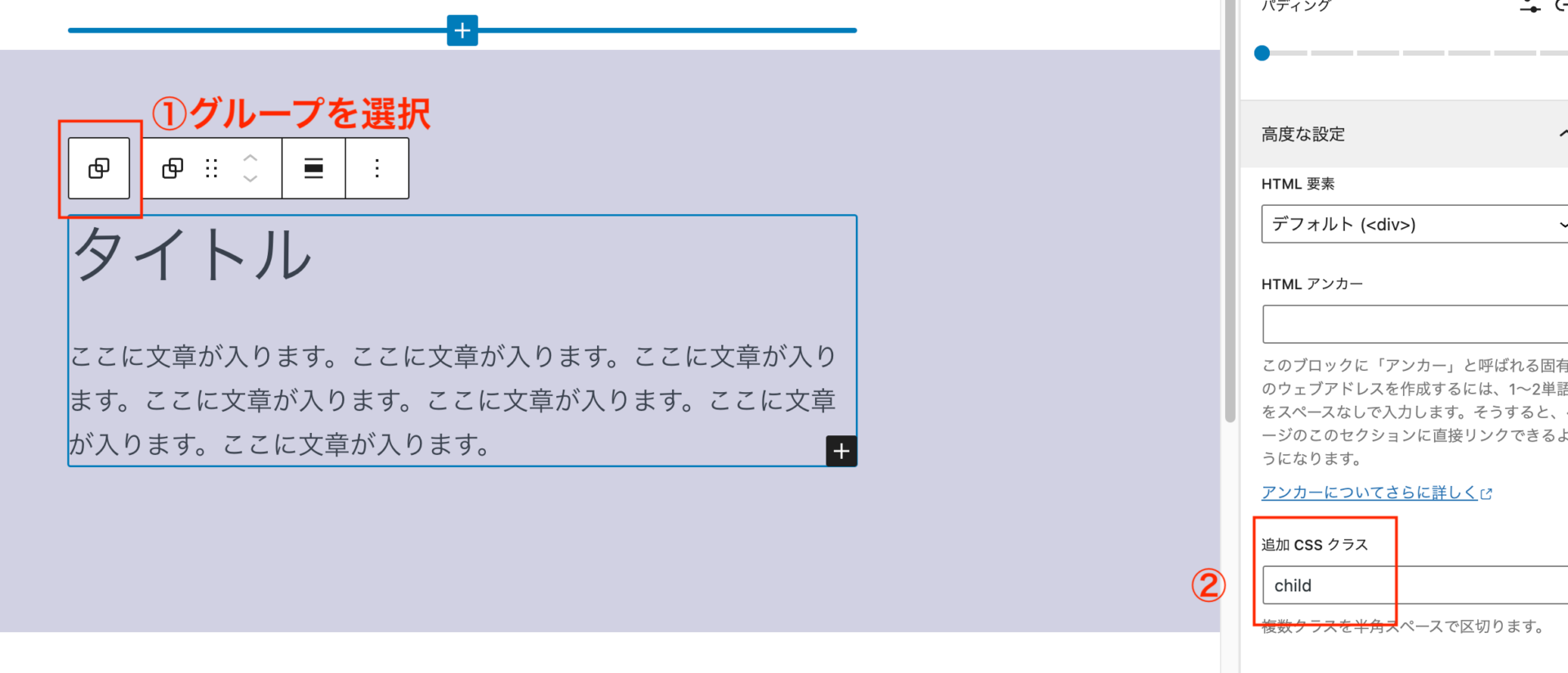 先ほど作ったグループブロックに、任意のクラス名を付けます。