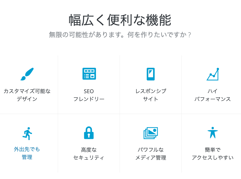 - 問い合わせフォームやショッピングカートなどが標準搭載されている