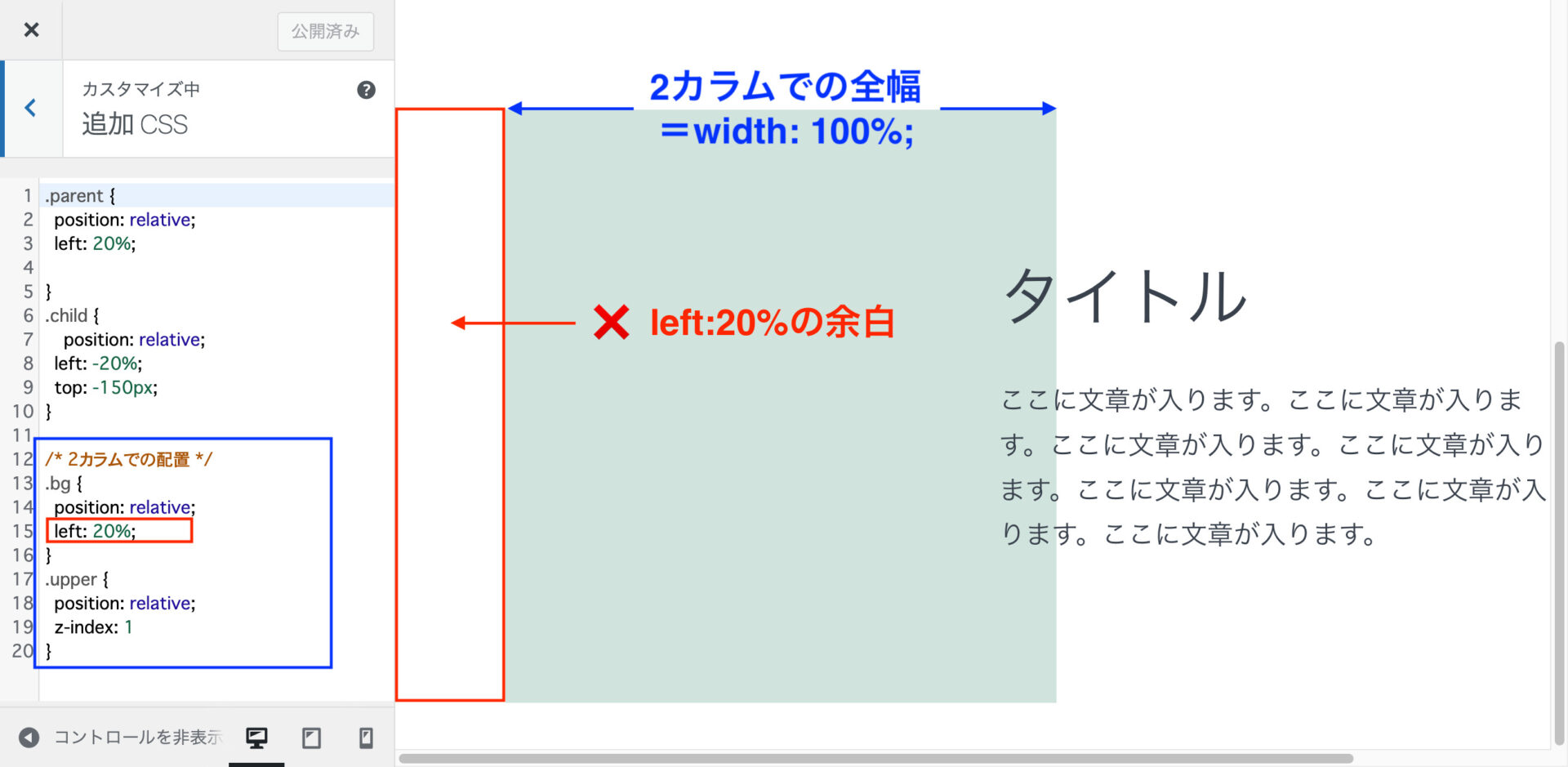 通常、親/子関係の場合 "relative"と"absolute" をセットで使う場合が多いですが、ワードプレスの場合カバーブロックで親要素の中に子要素を配置できるため、どちらも "relative"で指定しています。
