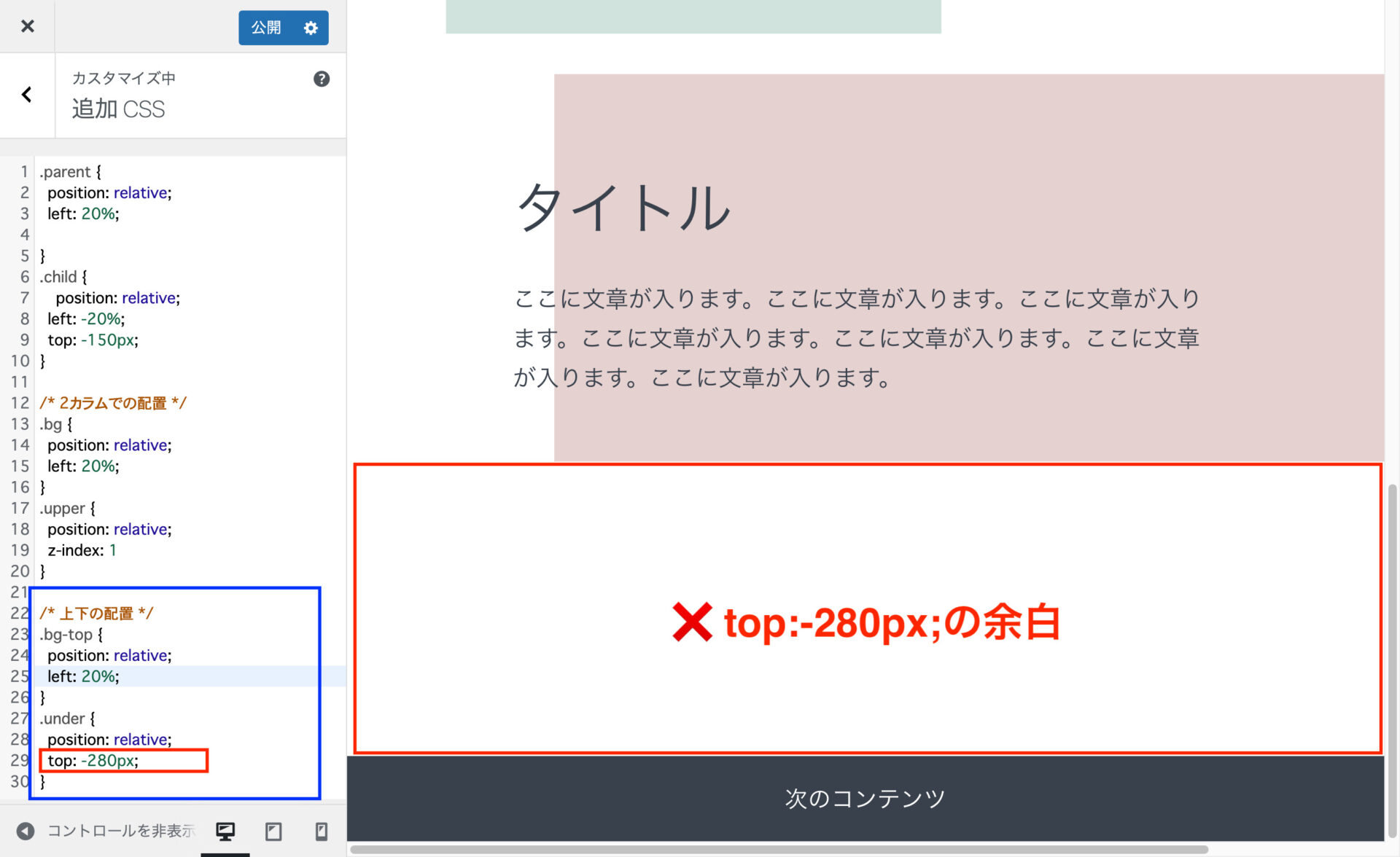また、子要素を上下にずらすことでも背景位置の見た目を簡単に変えられます。