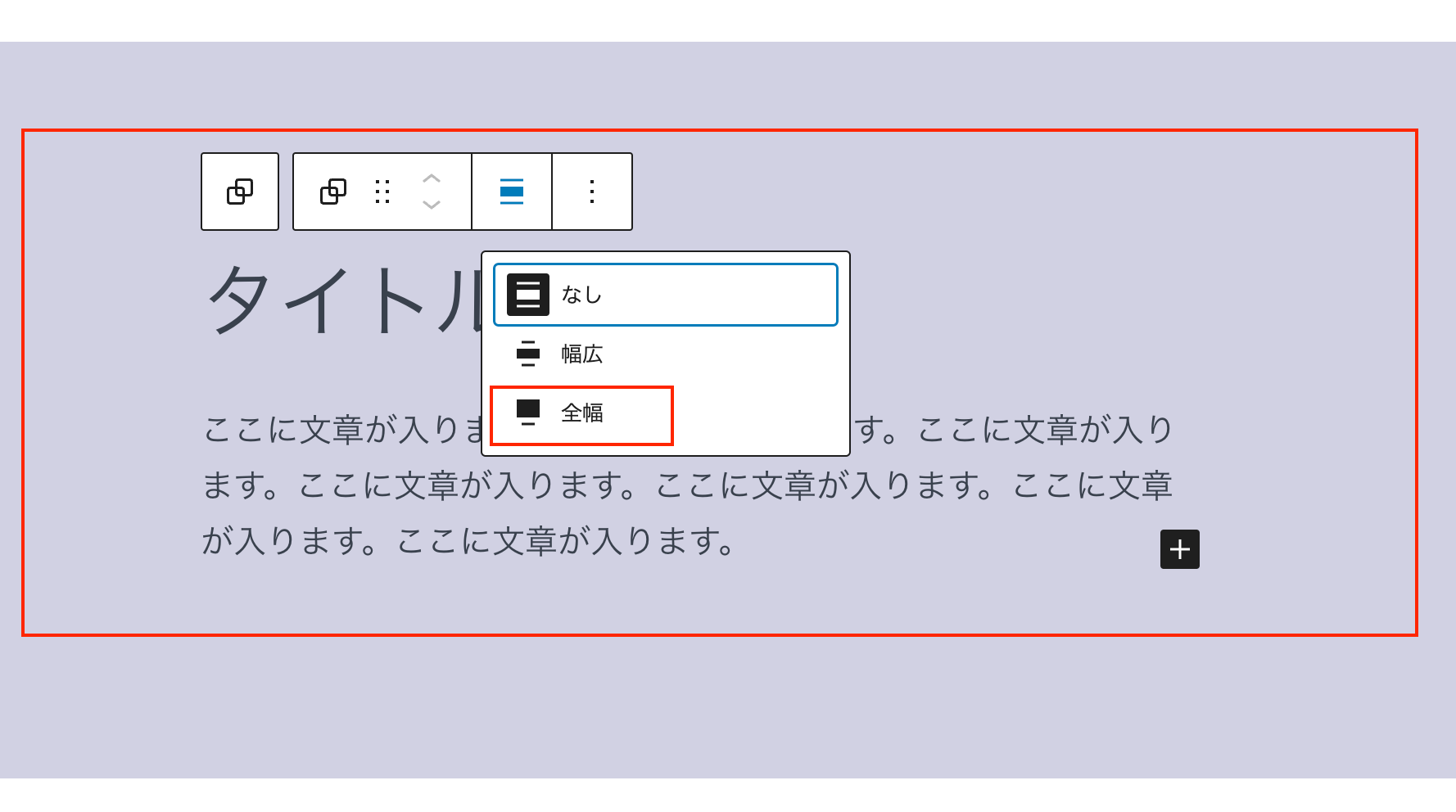 作成したコンテンツを全選択 > グループブロックに > グループを全幅に