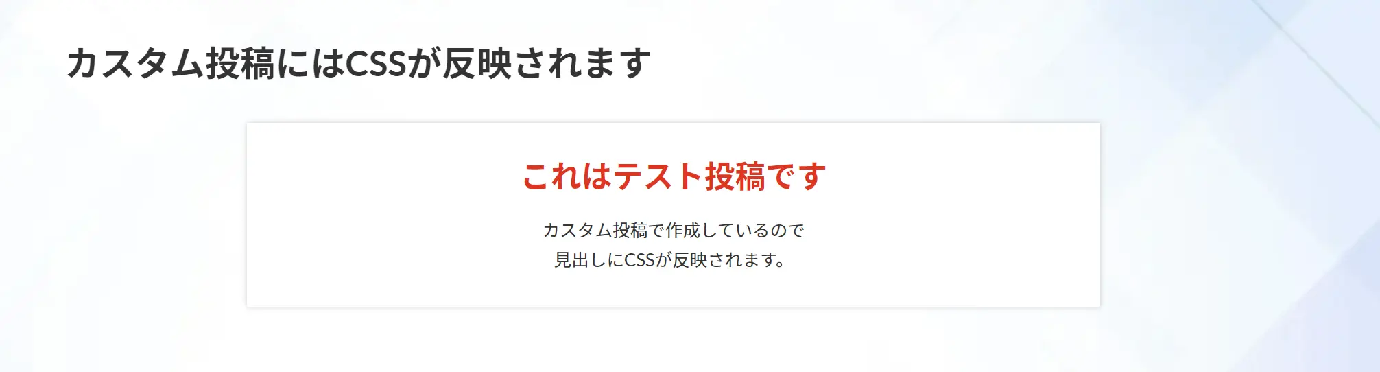 ※上記のコードのtestの部分を、CSSを反映させたいカスタム投稿タイプのスラッグに書き換えてください