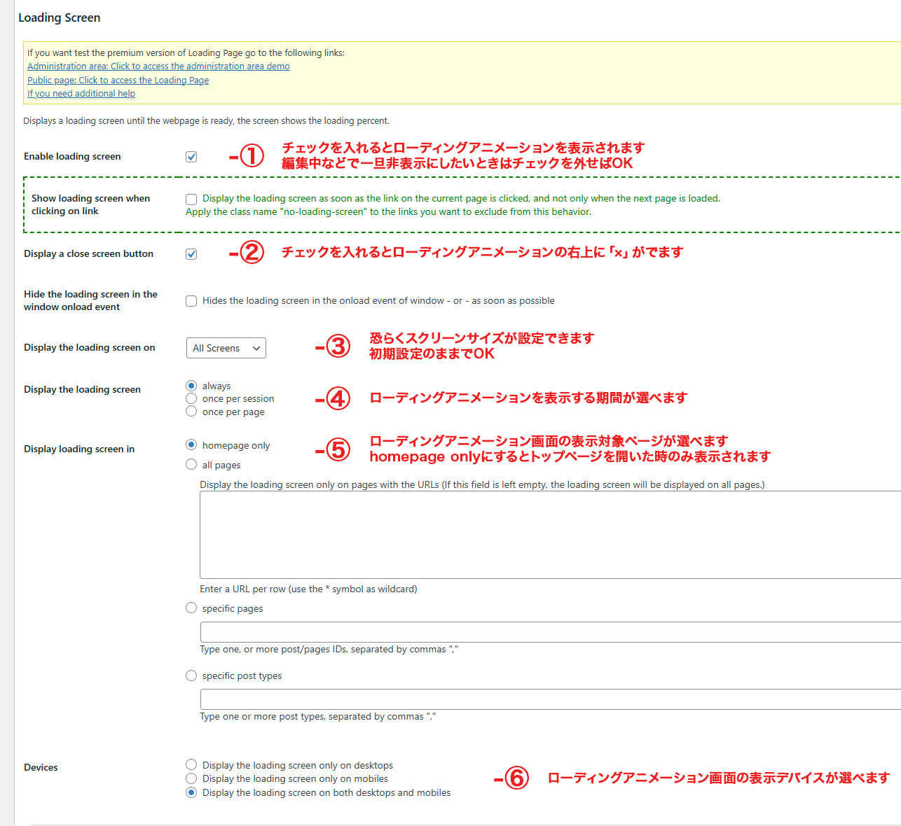 ⑤ローディングアニメーション画面の表示対象ページが選べます。