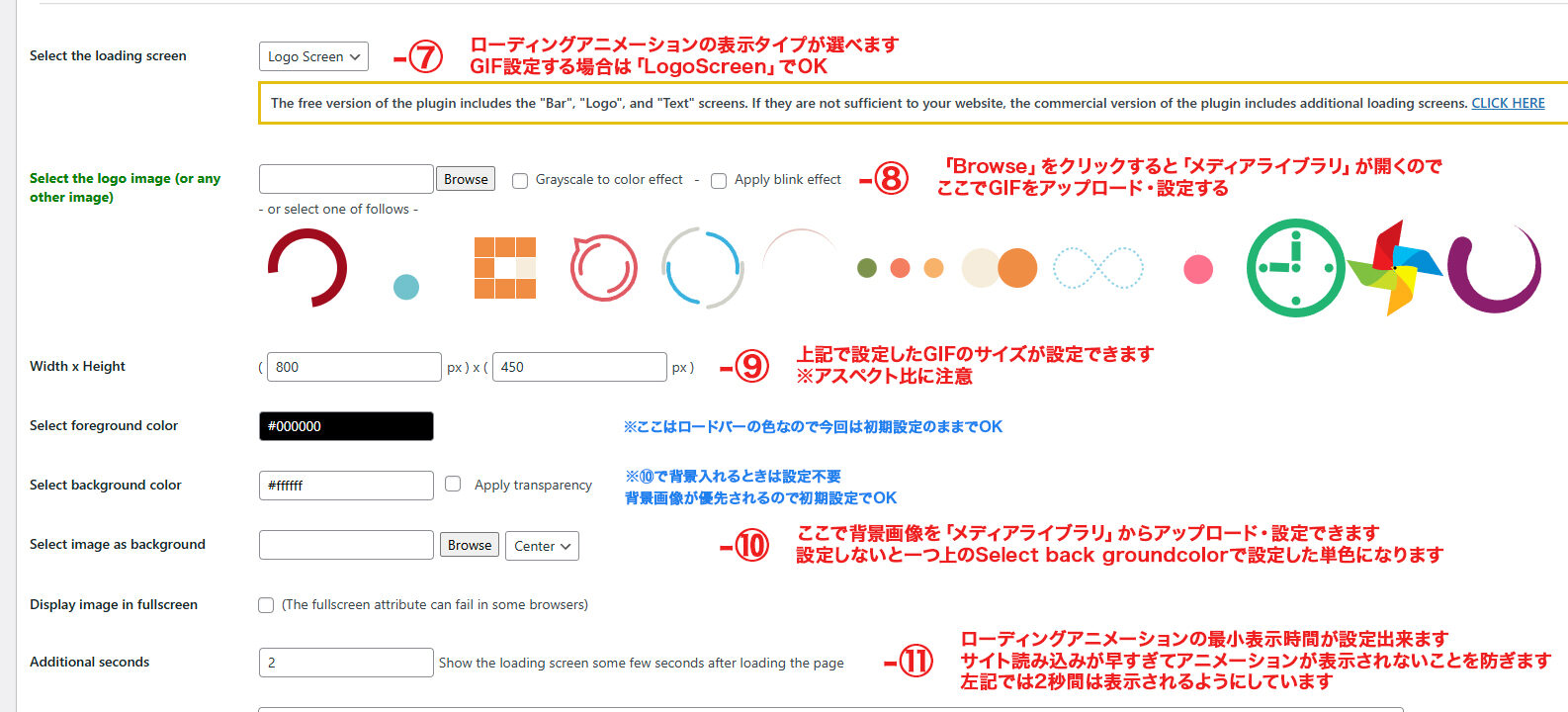 ⑪ローディングアニメーションの最小表示時間が設定できます。