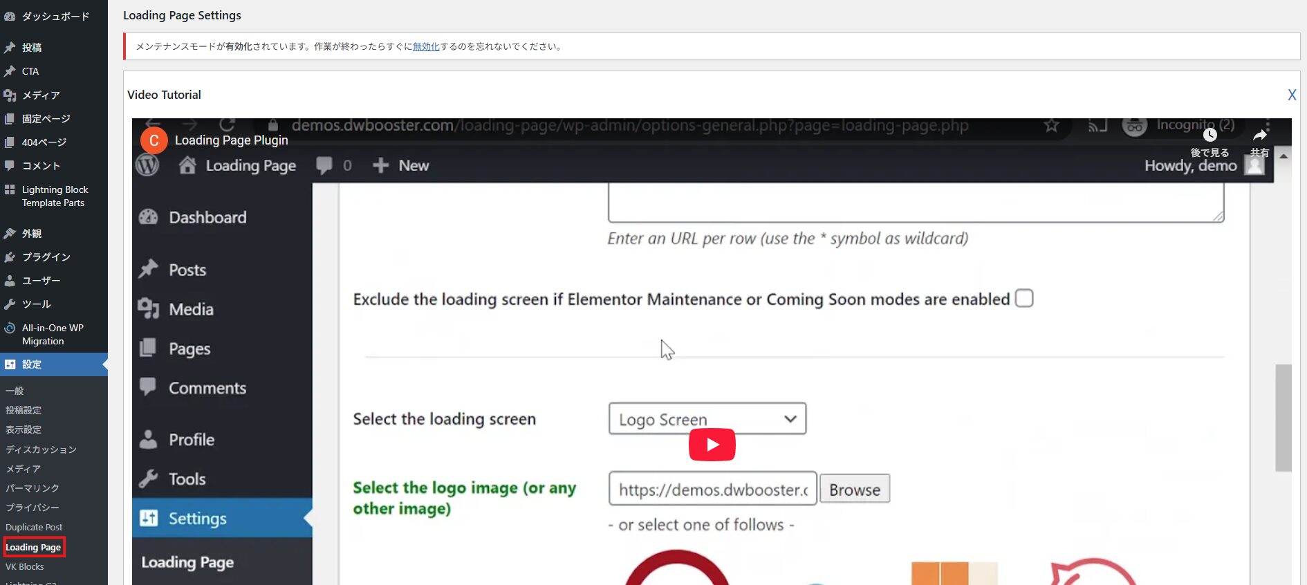 有効化した自動的に設定画面に遷移しますが、下記画像のように設定>Loading Pageからいつでも設定画面に行けます。