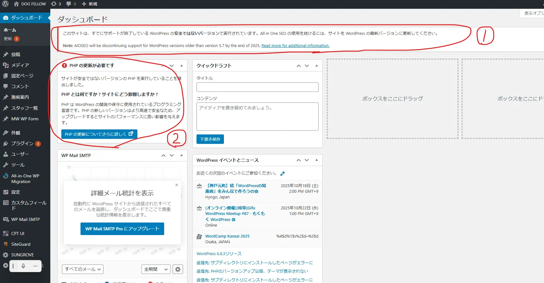 管理画面でのアラート表示や、プラグインの新バージョンで警告が出る、サーバーパネルに推奨外という表示が出るなど、兆候は管理画面内部に現れます。