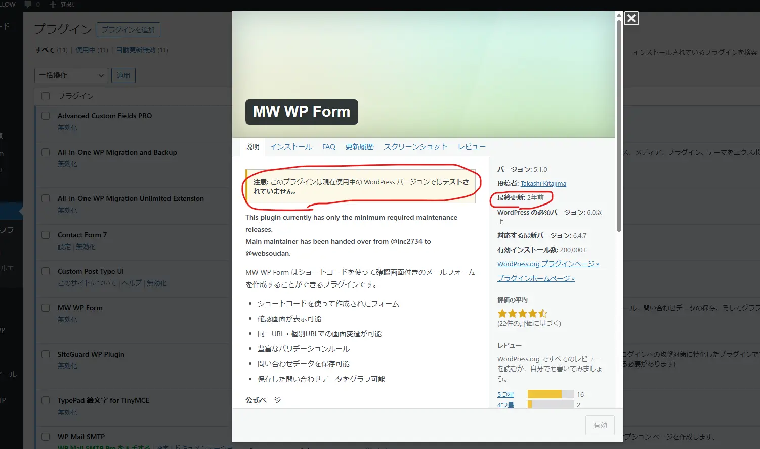 下記の画像は、PHPのアップグレード前に削除する方向で考えているプラグインを検討していた状態のキャプチャです。