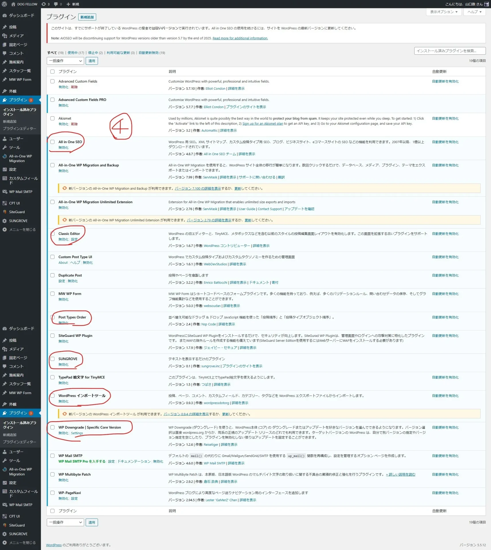 無効化状態のものや、赤丸を付けているプラグインは削除の方向で進めました。
