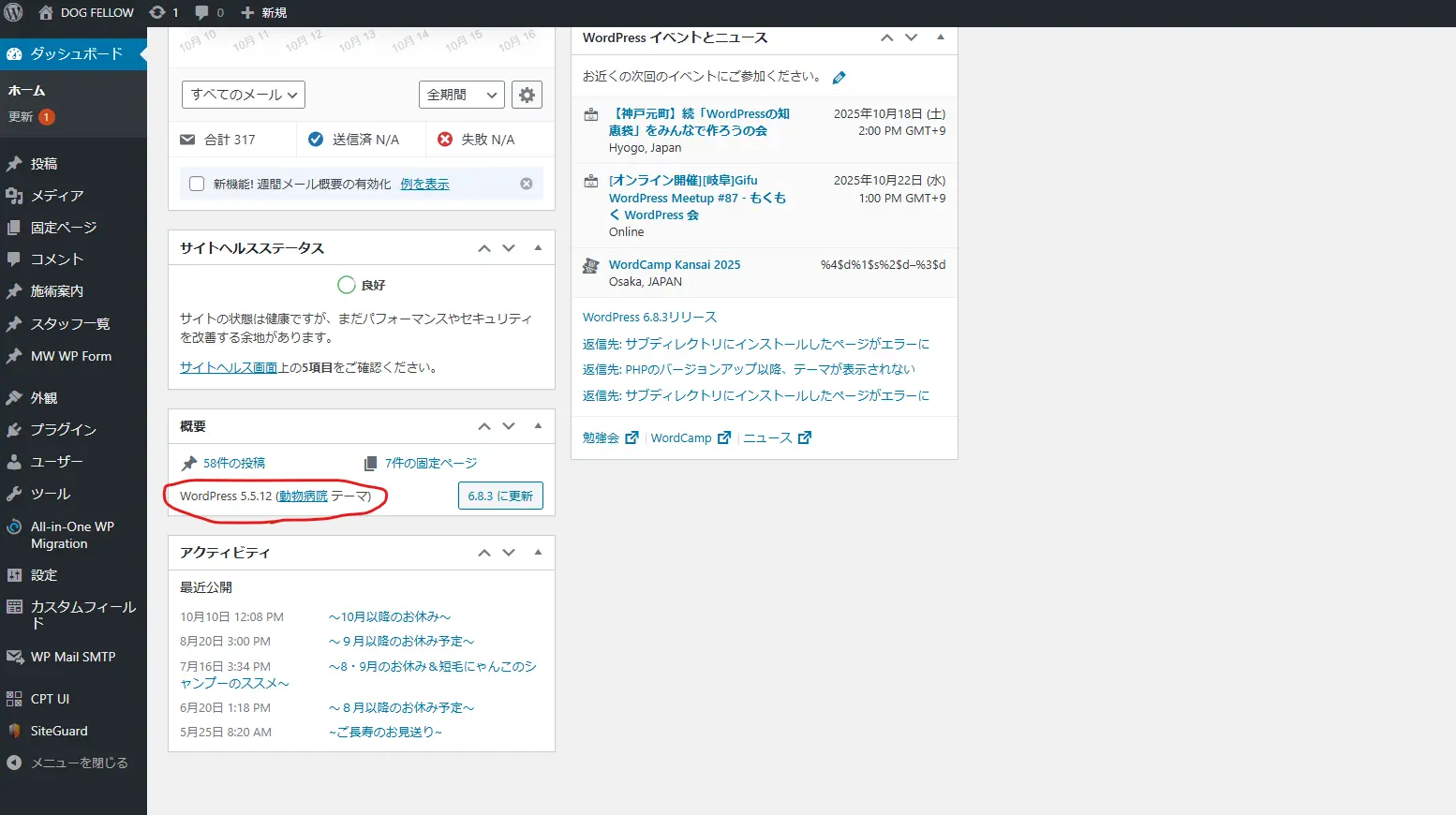 DOGFELLOW様のサイトを調査したところ、WordPressのバージョンは2020年9月1日に公開された「5.5」のままで止まっていました。