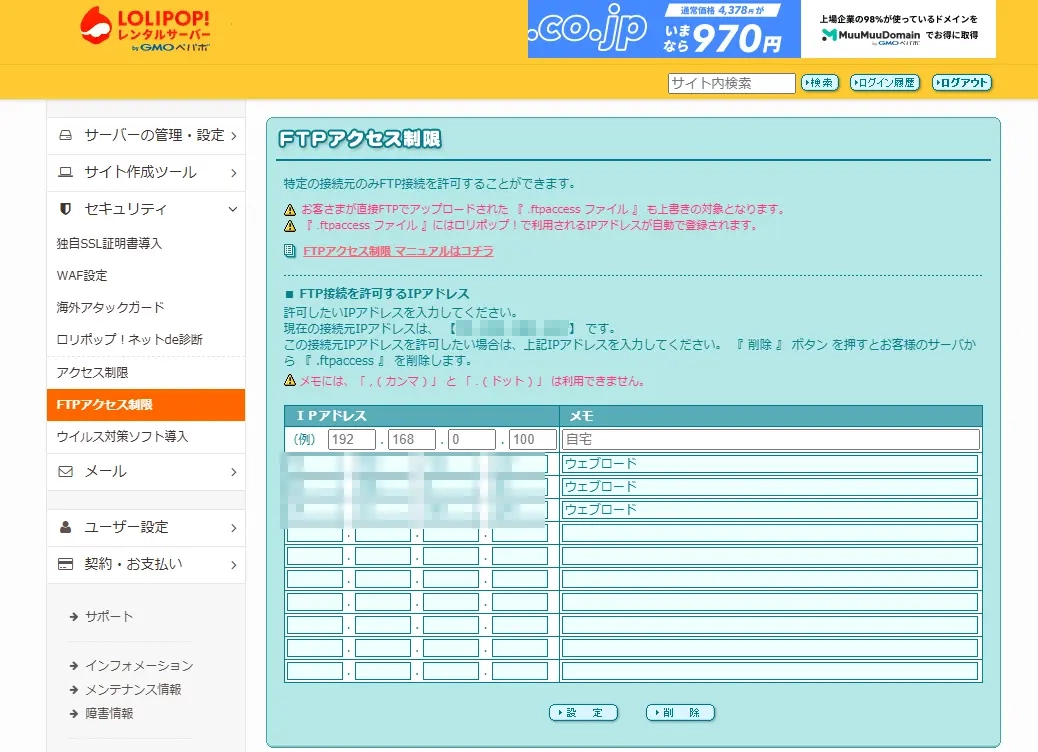 もちろんサーバーのWeb領域であるFTP接続にもIPアクセス制限をかけておりますが、DOGFELLOW様側では特にFTP接続はしないというお話でしたので、弊社スタッフ3名のみがアクセスできる形にしております。