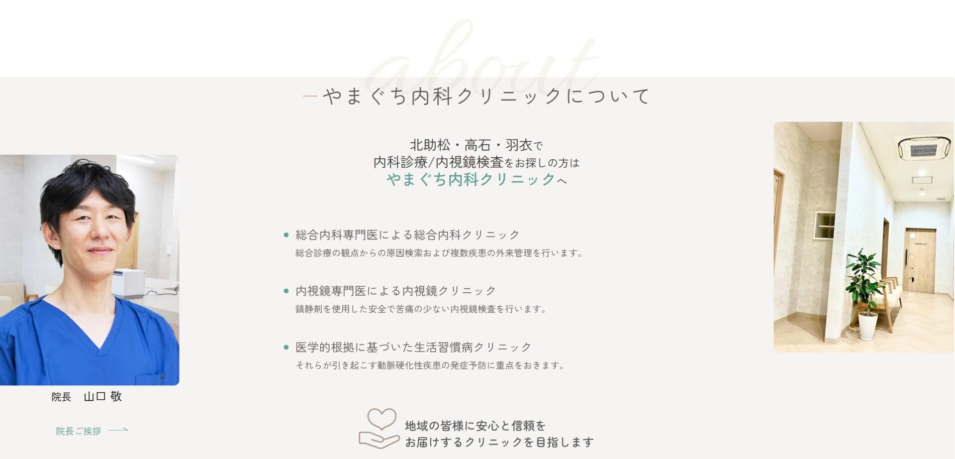 また、キャッチコピーには主な診療内容である「総合内科」「内視鏡検査」「生活習慣病診療」を盛り込み、クリニックや院長のお写真をスライドショーで表示することで、クリニックの特徴や雰囲気がより伝わる構成としました。